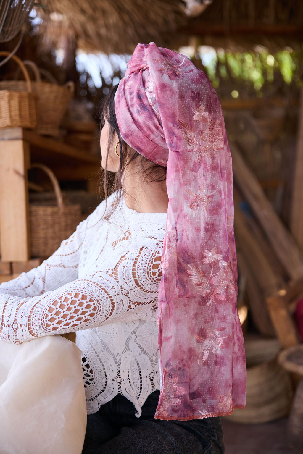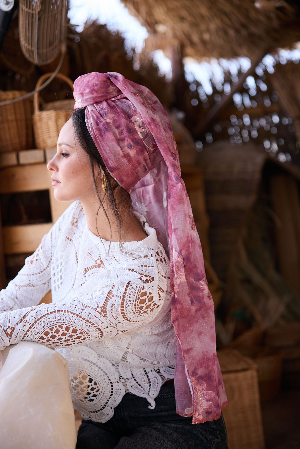 שילוב בדים: בד קליל ושקוף-למחצה עם הדפס פרחוני עדין וטקסטורה רכה, בגוון ורוד מעושן עם עומק טבעי, נופל בזרימה יפה ויוצר מראה נשי, רומנטי וקליל.