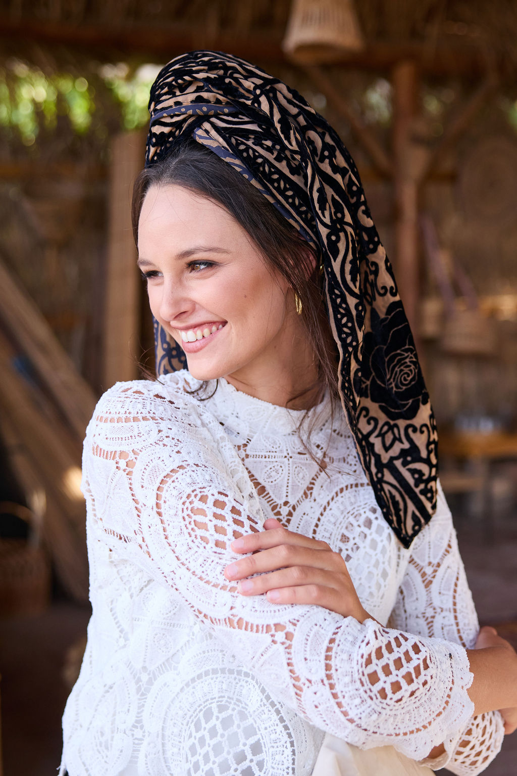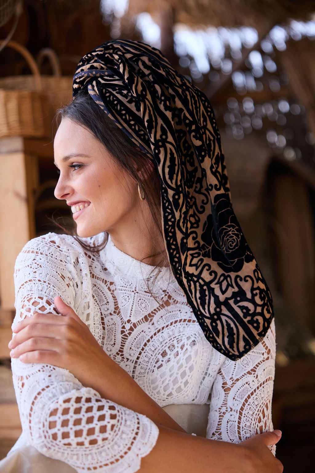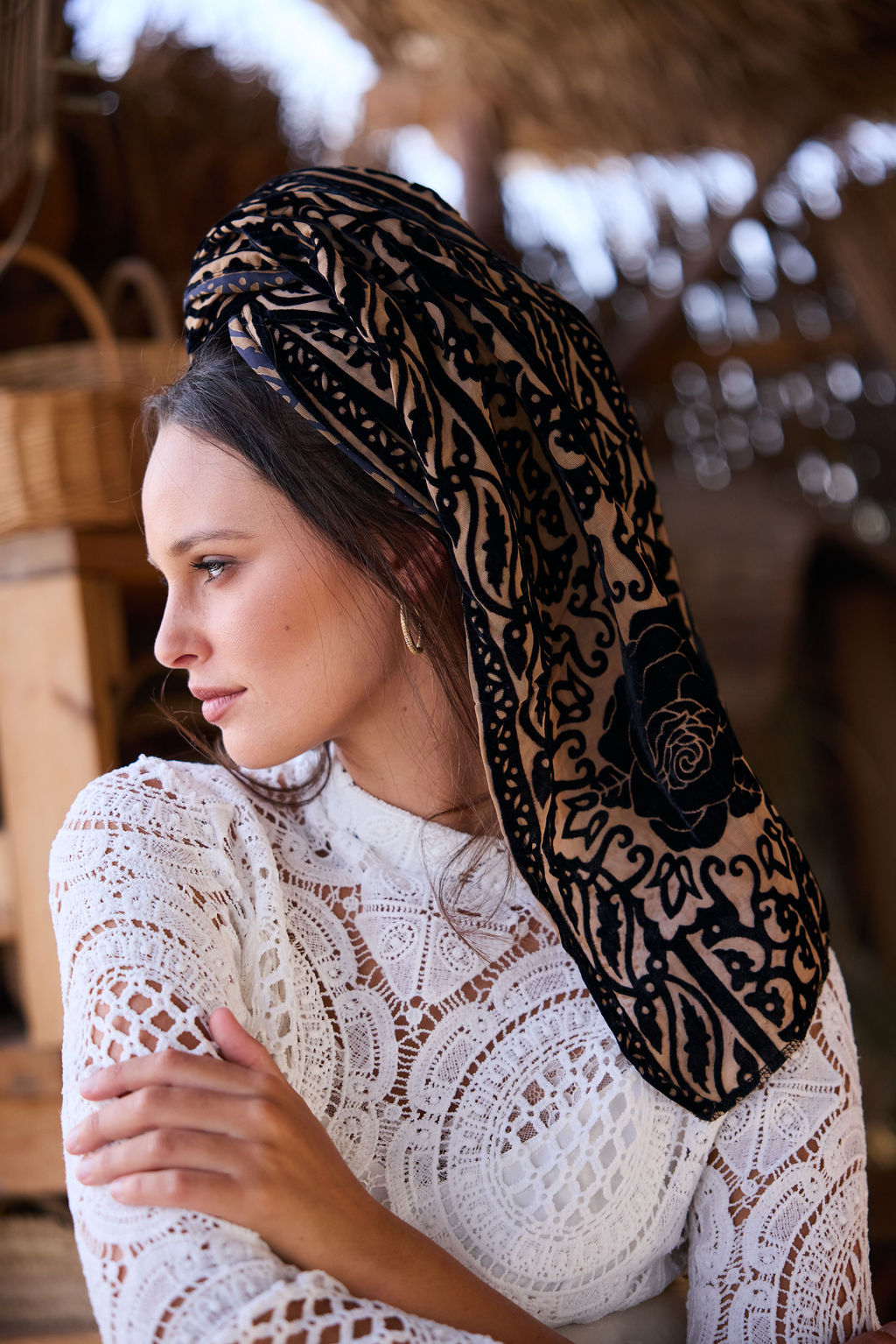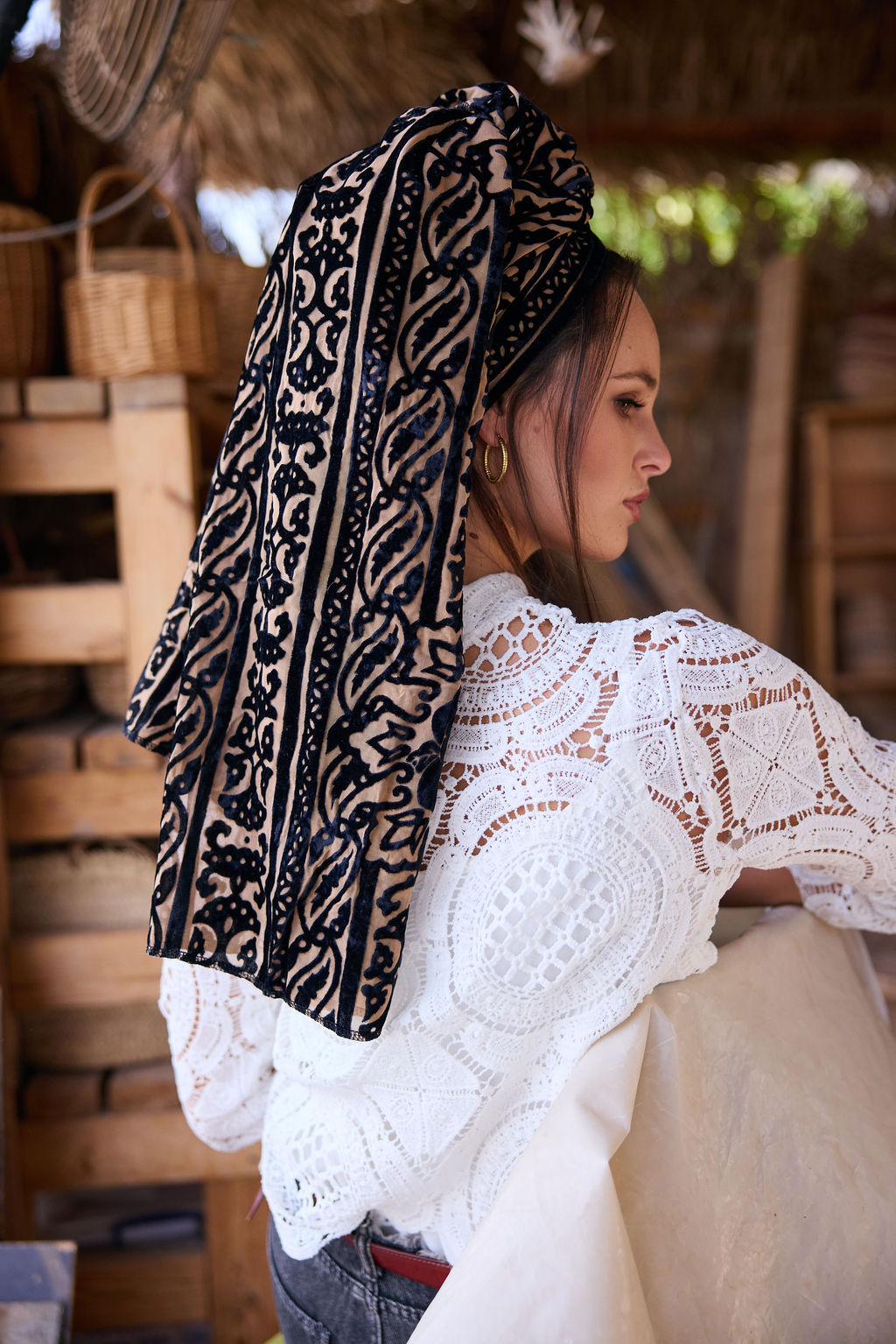 שילוב בדים: מטפחת מבד קטיפה צרובה עם טקסטורה עשירה ודוגמה בולטת, קלילה יחסית לקטיפה, נופלת ברכות ונותנת נוכחות עמוקה בלי להכביד.