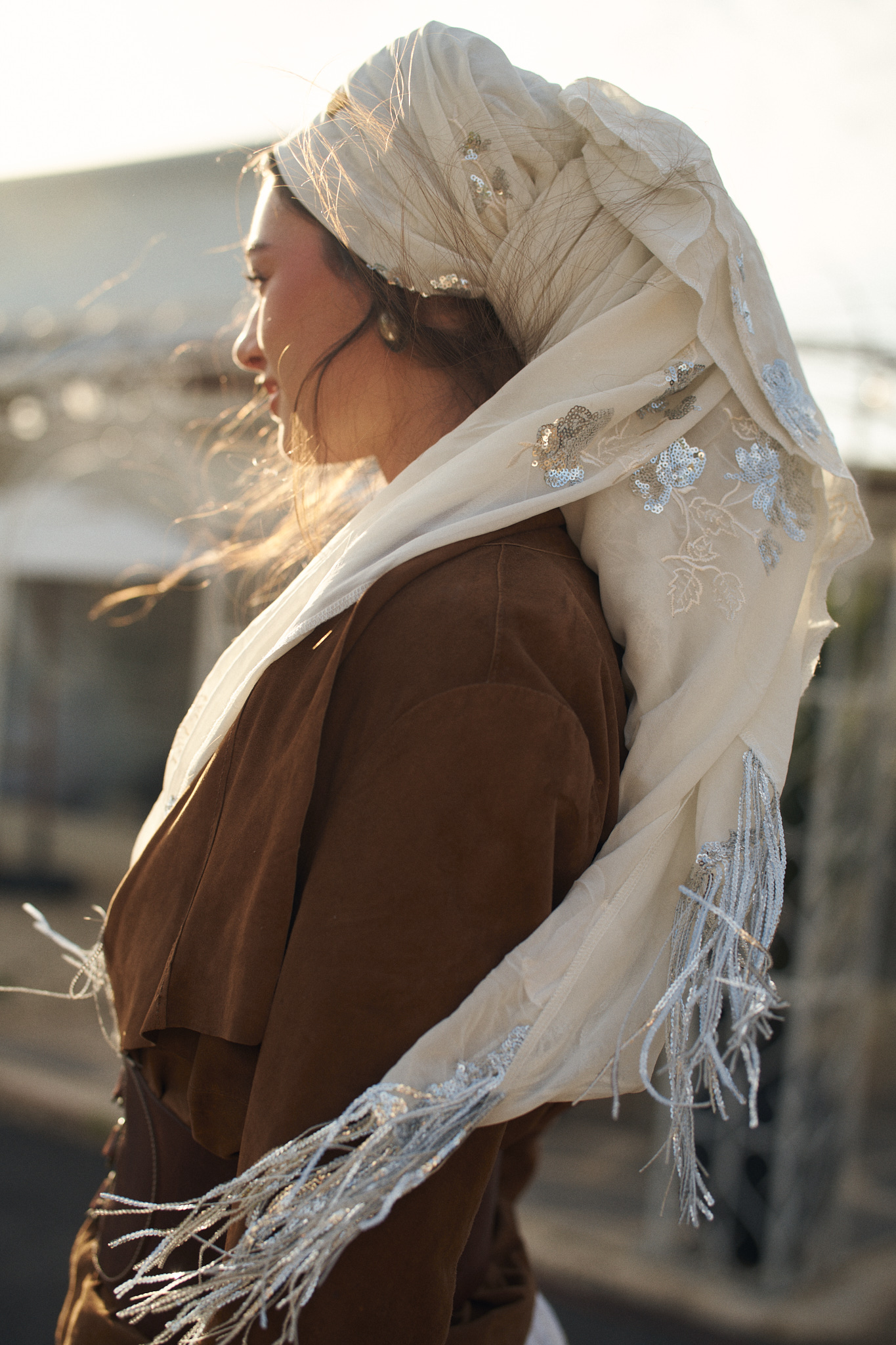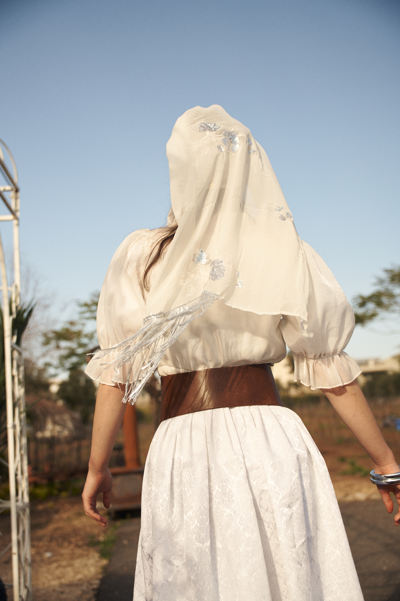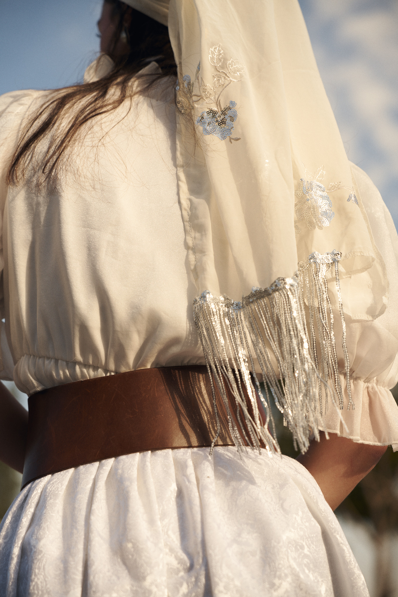 שילוב בדים: בד נשפך בגוון לבן שמנת, מעוטר ברקמת פרחי פאייטים כסופים ובסיומת פרנזים עדינה למראה חגיגי וייחודי.