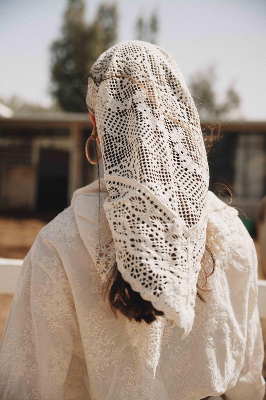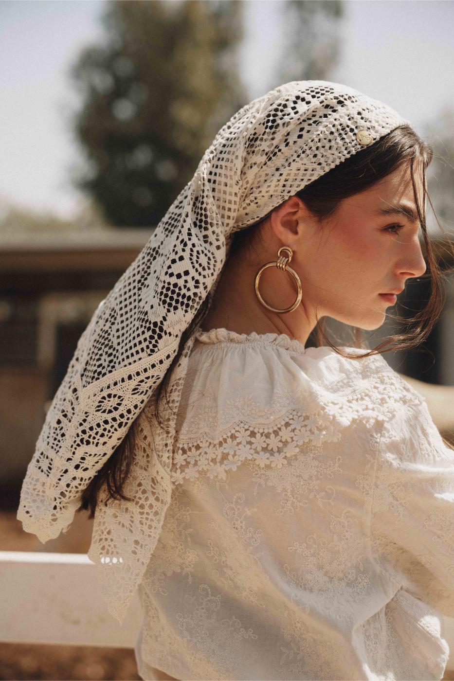 שילוב בדים: בד תחרת קרושה במראה טבעי שנעשה בצורה מסורתית, מסביב לכל הצורה יש פס קרושה רחב עם דוגמא יחודית שנותנת סיומת יפה ויחודית לכל המטפחת