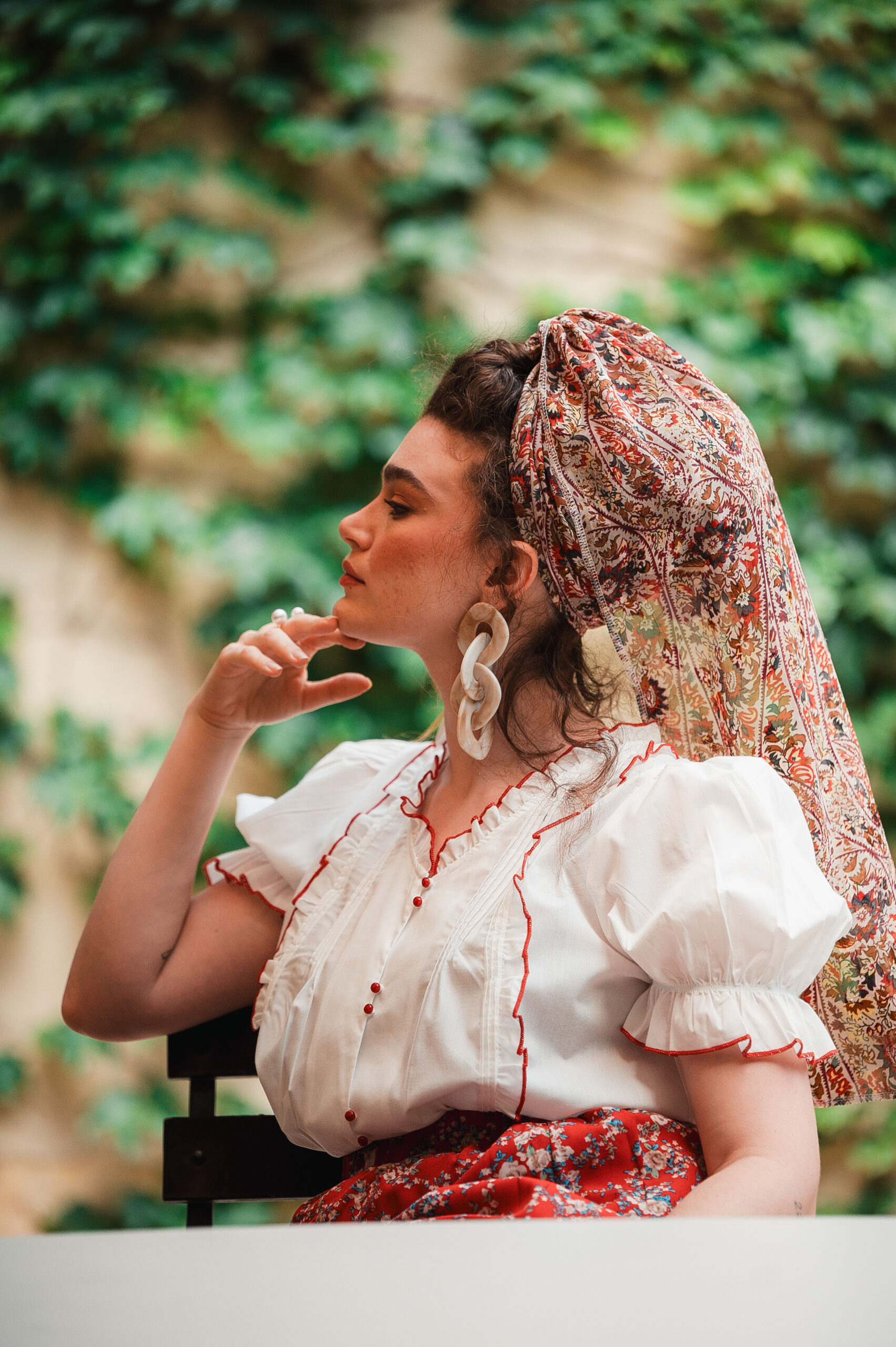 שילוב בדים: בד שיפון שמנת עם הדפסי פרחים ועיטורי עלים בצבעי בורדו,אדום,כחול וצהוב עדין.