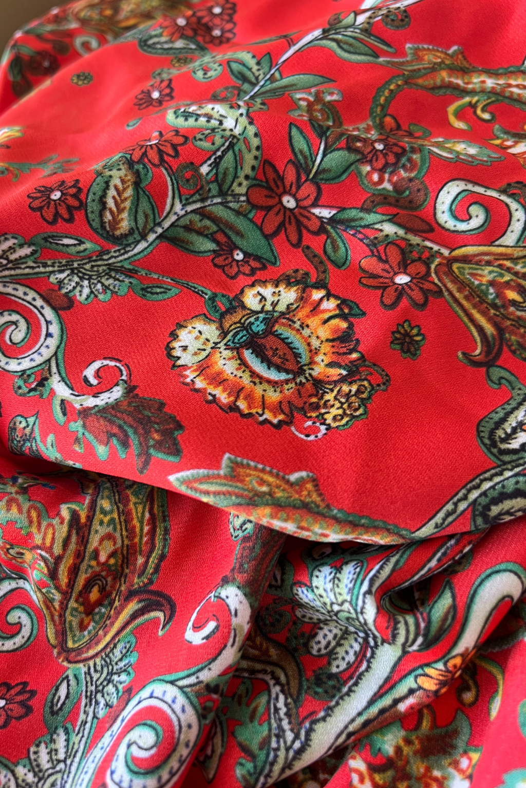 שילוב בדים: בד קליל ואוורירי בצבע אדום עם עיטורים אתניים ופרחוניים בצבעי ירוק וכתום .