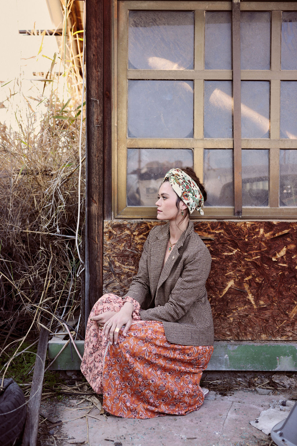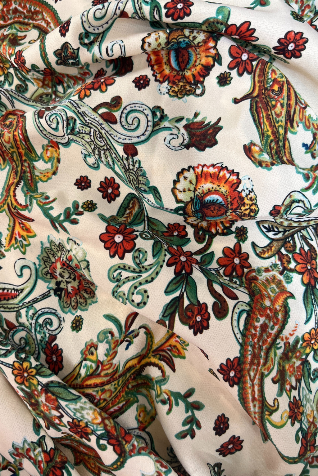 שילוב בדים: בד קליל ואוורירי בצבע שמנת עם עיטורים אתניים ופרחוניים בצבעי כתום וירוק .