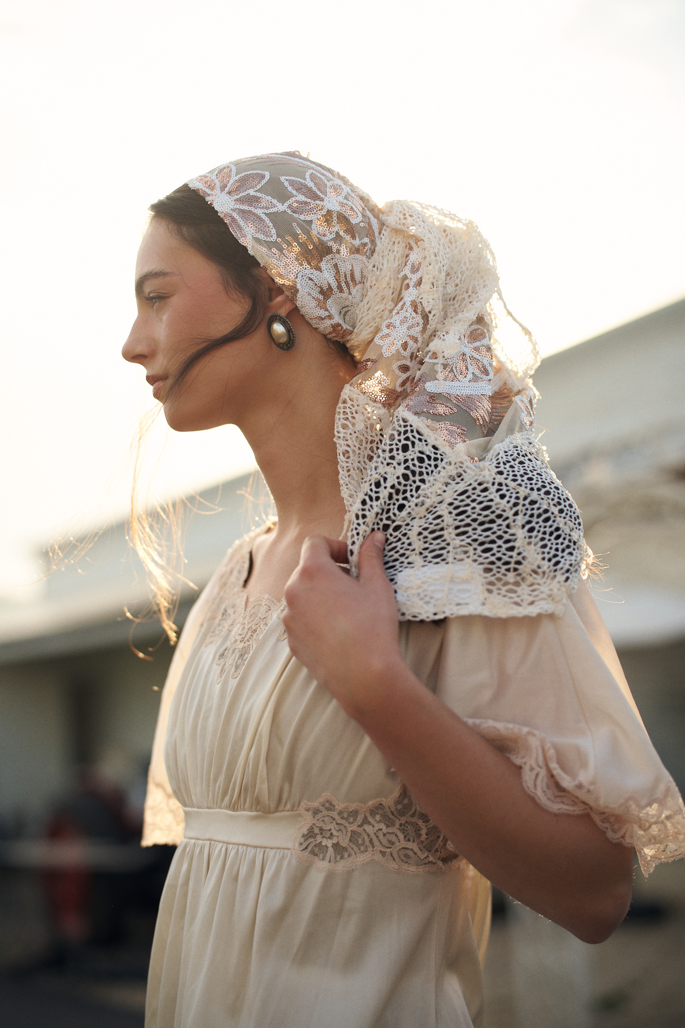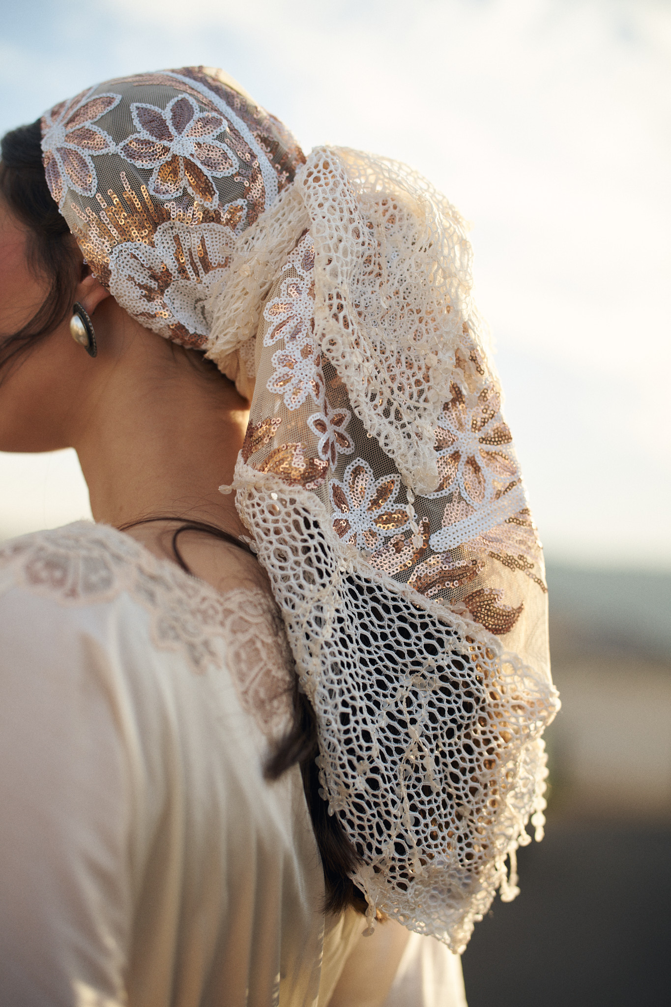 שילוב בדים: בד שמנת רך עם רקמת פרחי פאייטים ברוז-גולד, בשילוב רשת תחרה עשירה בסגנון וינטג' למראה חגיגי ורומנטי.